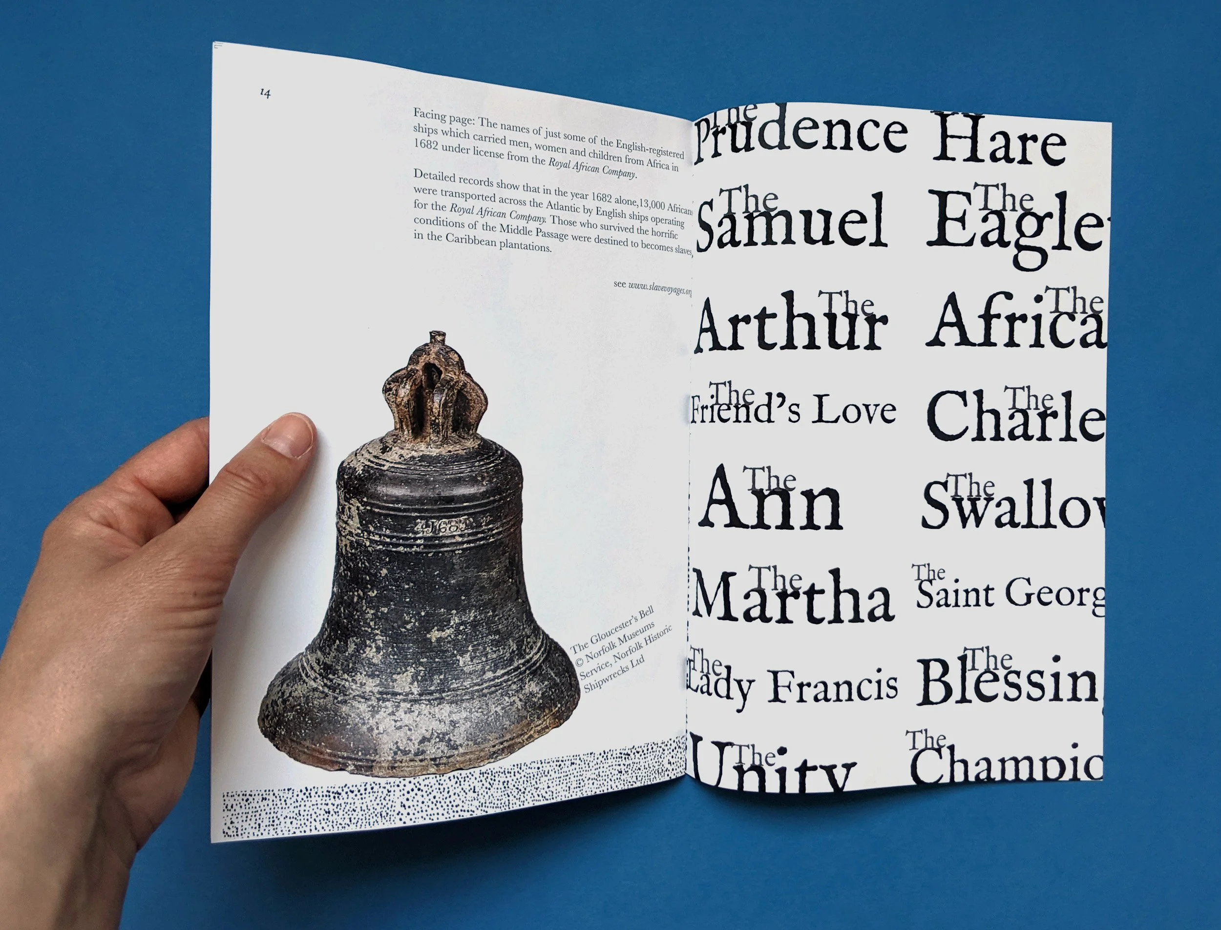The exhibition guide includes original artwork in the form of logotypes designed for some of the slaveships operated by the Royal African Company in 1682. My design work is research-led and is drawn from the incredible dataset of 12 million voyages available at : https://www.slavevoyages.org/