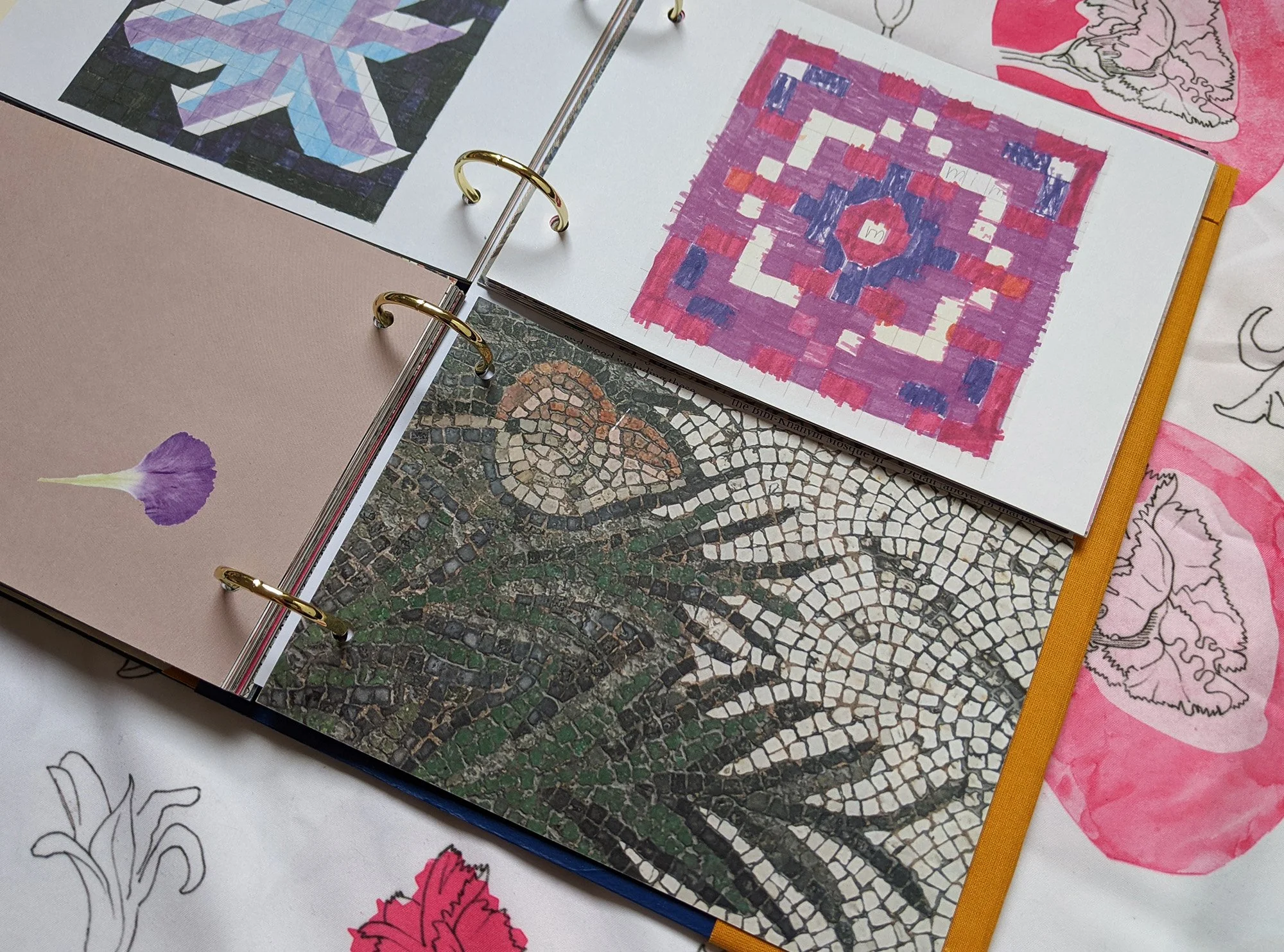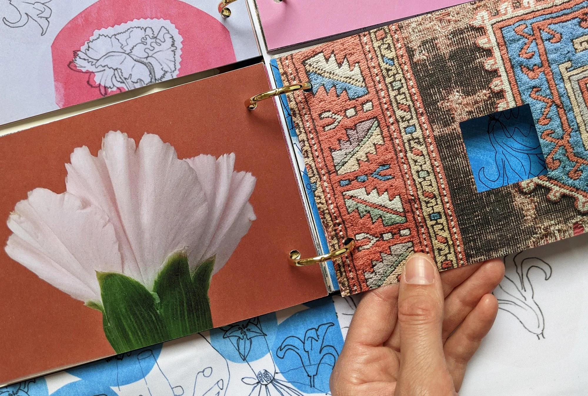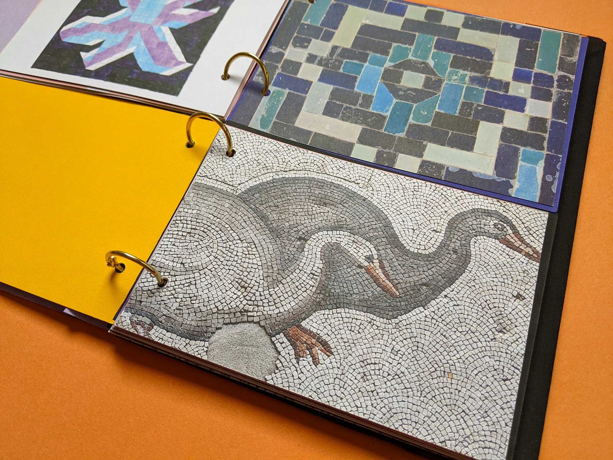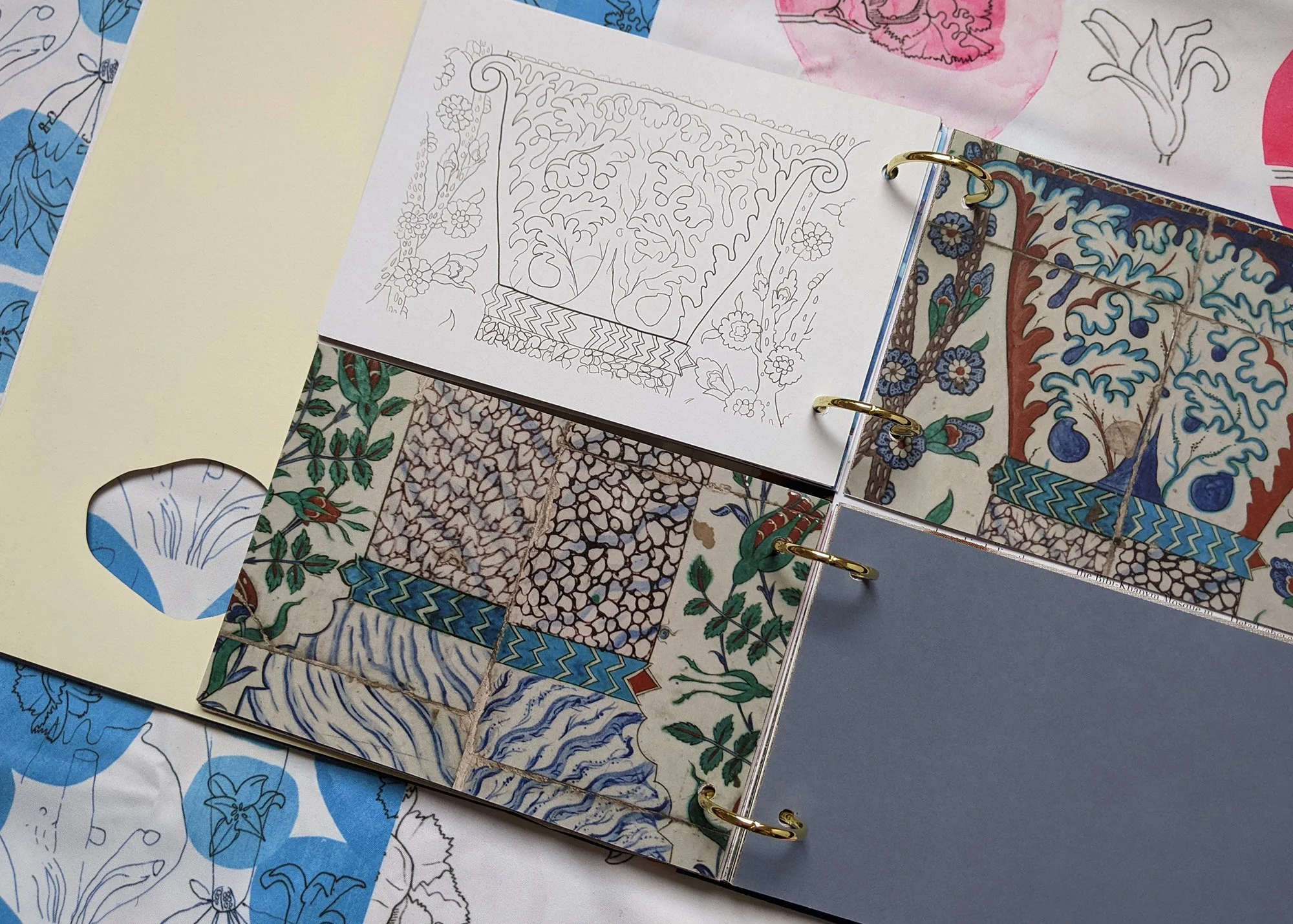 Brief: A self-directed design for print project featuring decorative arts seen on the walls and floors of Istanbul and new designs for patterns inspired by historic floral motifs. Laser cut ‘peep-through’ cutaways on the front cover and selected inners. Foiling on the cover. Inners printed by Hollinger Print Ltd on 300gsm stock for a tactile and colourful reading experience.